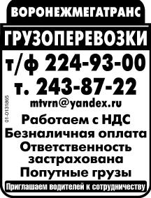 Грузоперевозки. Работаем с НДС. Безналичная оплата. Ответственность застрахована. Попутные грузы. Приглашаем водителей к сотрудничеству. Воронежмегатранс.