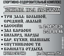 Банька под мостом спортивно-оздоровительный комплекс. Три зала: большой, средний, малый, бассейн, зал караоке, бильярд, нарды, бар, кухня, шашлык, спутниковое ТВ, комната отдыха. Круглосуточно.