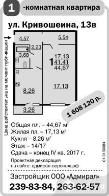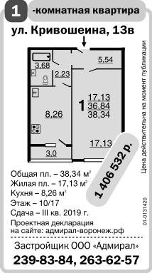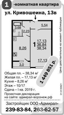 Кривошеина ул., №13в. Однокомнатная квартира. Общая площадь 38.34 кв.м. Жилая площадь 17.13 кв.м. Кухня 8.26 кв.м. Этаж 10/17. 1406532 р. Сдача - III квартал 2019 г. Проектная декларация на сайте: адмирал-воронеж.рф. Застройщик ООО Адмирал. Цена действительна на момент публикации.