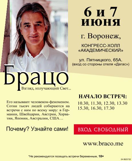 Брацо. Взгляд, излучающий Свет... 6 и 7 июня. г. Воронеж, конгресс-холл Академический. Начало встреч: 10.30, 11.30, 12.30, 13.30, 15.30, 16.30, 17.30. Вход свободный. Его называют человеком-феноменом. Сотни тысяч людей собираются на встречи с ним по всему миру: в Германии, Швейцарии, Австрии, Хорватии, Японии, Австралии, США... Почему? Узнайте сами! *Не рекомендуется посещать встречи беременным. 18+.
