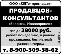 Продавцов-консультантов (Воронеж, Нововоронеж) приглашает ООО Кега. Зарплата до 28000 р., работа понедельно, в районе проживания, бесплатный развоз вечером.