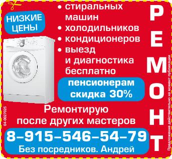 Ремонт стиральных машин, холодильников, кондиционеров. Выезд и диагностика бесплатно. Низкие цены. Пенсионерам скидка 30%. Ремонтирую после других мастеров. Без посредников. Андрей. Предложение действительно на момент публикации.
