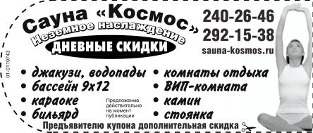 Сауна Космос. Джакузи, водопады, бассейн 9х12 м, караоке, бильярд, комнаты отдыха, ВИП-комната, камин, стоянка. Неземное наслаждение. Дневные скидки. Предложение действительно на момент публикации. Предъявителю купона дополнительная скидка.