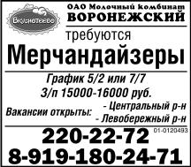 Перейти к актуальным объявлениям автора. Перейти к актуальным объявлениям рубрики Дистрибьюторы, дилеры, мерчандайзеры. Мерчандайзеры ОАО Молочный комбинат Воронежский требуются