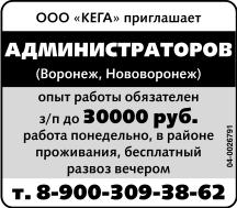Администраторов (Воронеж, Нововоронеж) приглашает ООО Кега. Опыт работы обязателен, зарплата до 30000 р., работа понедельно, в районе проживания, бесплатный развоз вечером.