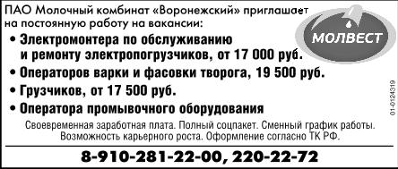 Электромонтера по обслуживанию и ремонту электропогрузчиков, от 17 тыс. р., операторов варки и фасовки творога, от 19.5 тыс. р., грузчиков, от 17.5 тыс. р., оператора промывочного оборудования ОАО Молочный комбинат Воронежский приглашает на постоянную работу. Своевременная заработная плата. Полный соцпакет. Сменный график работы. Возможность карьерного роста. Оформление согласно ТК РФ. Молвест.