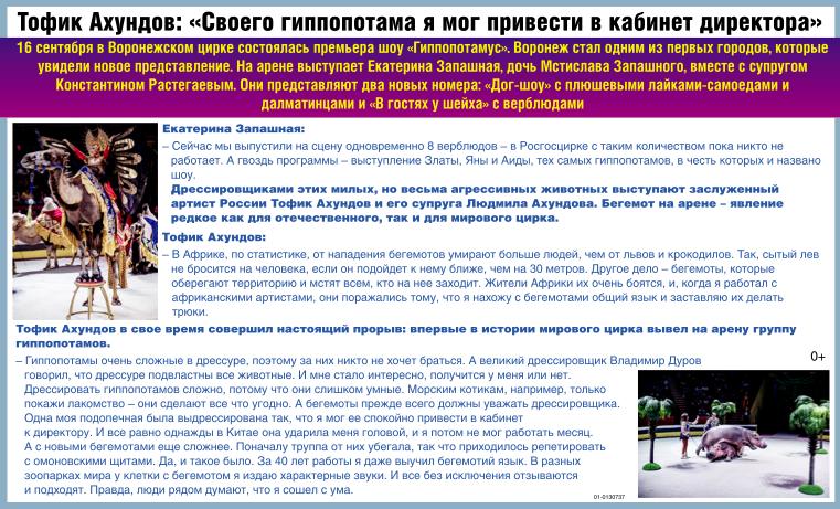 Премьера шоу Гиппопотамус состоялась 16 сентября в Воронежском цирке. Воронеж стал одним из первых городов, которые увидели новое представление. На арене выступает Екатерина Запашная, дочь Мстислава Запашного, вместе с супругом Константином Растегаевым. Они представят два новых номера: Дог-шоу с плюшевыми лайками-самоедами и далматинцами, и В гостях у шейха с верблюдами. Екатерина Запашная: Сейчас мы выпустили на сцену одновременно 8 верблюдов – в Росгосцирке с таким количеством пока никто не работает. А гвоздь программы – выступление Златы, Яны и Аиды – тех самых гиппопотамов, в честь которых и названо шоу. Дрессировщиками этих милых, но весьма агрессивных животных выступают заслуженный артист России Тофик Ахундов и его супруга Людмила Ахундова. Бегемот на арене – явление редкое как для отечественного, так и для мирового цирка. Тофик Ахундов: В Африке, по статистике, от нападения бегемотов умирают больше людей, чем от львов и крокодилов. Так, сытый лев не бросится на человека, если он подойдет к нему ближе 30 метров. Другое дело - бегемоты, которые оберегают территорию и мстят всем, кто на нее заходит. Жители Африки их очень боятся, и когда я работал с африканскими артистами, они поражались тому, что я нахожу с бегемотами общий язык и заставляю их делать трюки. Тофик Ахундов в свое время совершил настоящий прорыв – впервые в истории мирового цирка вывел на арену группу гиппопотамов. Гиппопотамы очень сложные в дрессуре, поэтому за них никто не хочет браться. А великий дрессировщик Владимир Дуров говорил, что дрессуре подвластны все животные. И мне стало интересно – получится у меня или нет. Дрессировать гиппопотамов сложно, потому что они слишком умные. Морским котикам, например, только покажи лакомство – они сделают все, что угодно. А бегемоты прежде всего должны уважать дрессировщика. Одна моя подопечная была выдрессированна так, что я мог ее спокойно привести в кабинет к директору. И все равно однажды в Китае она ударила меня головой, что я потом не мог работать месяц. А с новыми бегемотами еще сложнее. Поначалу труппа от них убегала, мы репетировали с омоновскими щитами. Да, и такое было. За 40 лет работы я даже выучил бегемотий язык. В разных зоопарках мира у клетки с бегемотом я издаю характерные звуки. И все без исключения отзываются и подходят. Правда, люди рядом думают, что я сошел с ума. 0+.