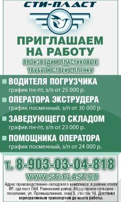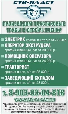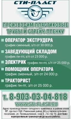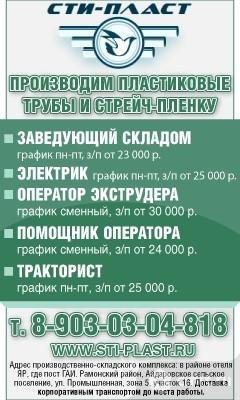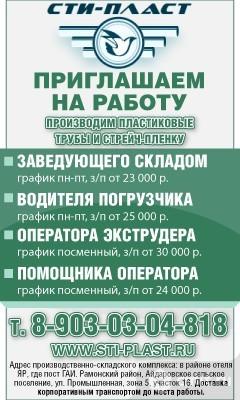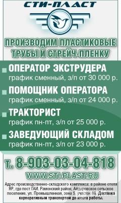 Производим пластиковые трубы и стрейч-пленку. Приглашаем на работу: заведующего складом, график пн-пт, зарплата от 23 тыс. р.; оператора производственной линии, график посменный, зарплата от 30 тыс. р.; помощника оператора, график посменный, зарплата от 24 тыс. р. Адрес производственно-складского комплекса: в районе отеля Яр, где пост ГАИ, Рамонский район, Айдаровское сельское поселение, ул. Промышленная, зона 5, участок 16. Доставка корпоративным транспортом до места работы.