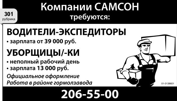 Водители-экспедиторы, зарплата от 39 тыс. р., уборщицы/уборщики, неполный рабочий день, зарплата 13 тыс. р., компании Самсон требуются. Официальное оформление. Работа в районе гормолзавода.