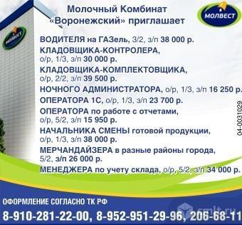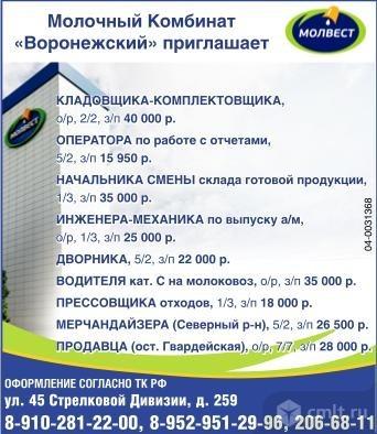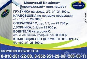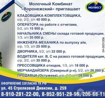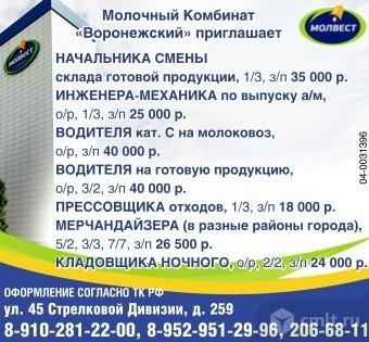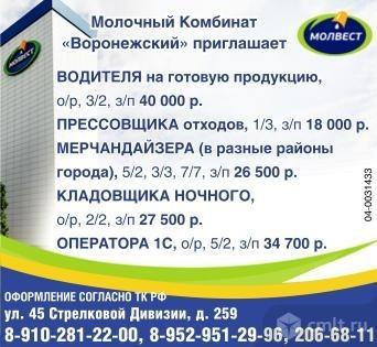 Водитель на готовую продукцию, опыт работы, график 3/2, зарплата 40 тыс. р.; прессовщик отходов, график 1/3, зарплата 18 тыс. р.; мерчандайзер (в разные районы города), график 5/2, 3/3, 7/7, зарплата 26.5 тыс. р.; кладовщик ночной, опыт работы, график 2/2, зарплата 27.5 тыс. р., оператор 1С, опыт работы, график 5/2, зарплата 34.7 тыс. р. Молочный Комбинат "Воронежский" приглашает. Оформление согласно ТК РФ. Молвест.