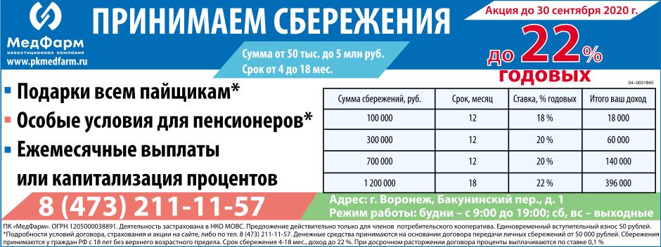 Потребительский кооператив МедФарм. Принимаем сбережения до 22% годовых. Сумма от 50 тыс. р. до 5 млн. р. Срок от 4 до 18 мес. Акция до 30 сентября 2020 г. Подарки всем пайщикам.* Особые условия для пенсионеров. * Ежемесячные выплаты или капитализация процентов. ПК "МедФарм". ОГРН 1205000038891. Деятельность застрахована в НКО МОВС. Предложение действительно только для членов потребительского кооператива. Единовременный вступительный взнос 50 рублей. * Подробности условий договора, страхования и акции на сайте, либо по телефону 8(473) 211-11-57. Денежные средства принимаются на основании договора передачи личных сбережений от 50 тыс. р. Сбережения принимаются у граждан РФ с 18 лет без верхнего возрастного предела. Срок сбережения 4-18 мес., доход до 22%. При досрочном расторжении договора проценты выплачиваются по ставке 0.1%.