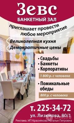Приглашаем провести любое мероприятие. Великолепная кухня. Демократичные цены. Свадьбы. Банкеты. Корпоративы. 1.8 тыс. р. с человека. Поминальные обеды, 800 р. с человека.