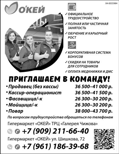 Продавец (без кассы), 36.5-41 тыс. р., кассир-операционист, 36.5-41.5 тыс. р., фасовщица/ фасовщик, 26.3-30.2 тыс. р., мойщица/ мойщик, 26.3-30.2 тыс. р., мойщица/ мойщик, 26.3-30.2 тыс. р., повар, 38-43.7 тыс. р. Приглашаем в команду Окей! Официальное трудоустройство. Полная или частичная занятость. Обучение и карьерный рост. Корпоративная система бонусов. Скидки на товары для сотрудников. Оплата медкнижки и ДМС. По вопросам трудоустройства обращаться по телефонам: