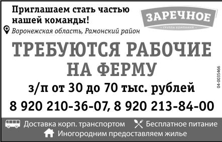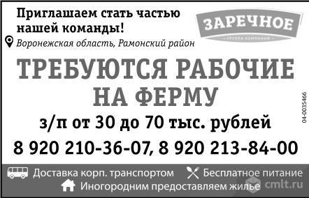 Рабочие на ферму требуются. Зарплата от 30 до 70 тыс. р. Доставка корпоративным транспортом. Бесплатное питание. Иногородним предоставляем жилье. Приглашаем стать частью нашей команды! Группа компаний Заречное. Воронежская область, Рамонский район.