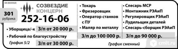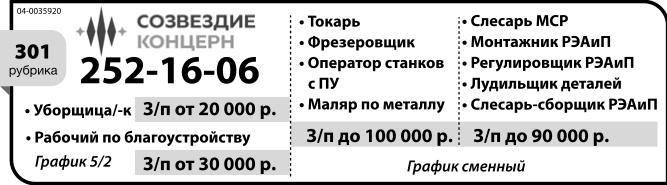 Токарь, фрезеровщик, оператор станков с ПУ, маляр по металлу, зарплата до 100 тыс. р. Слесарь МСР, монтажник РЭАиП, регулировщик РЭАиП, лудильщик деталей, слесарь-сборщик РЭАиП, зарплата до 90 тыс. р. График сменный. Уборщица/ уборщик, зарплата от 20 тыс. р. Рабочий по благоустройству, зарплата от 30 тыс. р. График 5/2. Концерн Созвездие.