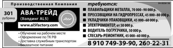 Плавильщики металла, 70-90 тыс. р., прессовщики на гидропрессах, 45-80 тыс. р., укладчики-упаковщики, 45-60 тыс. р., электромонтер, от 50 тыс. р., водитель погрузчика, 50 тыс. р., слесарь-ремонтник, 45-60 тыс. р. Приглашает производственная компания АВА-Трейд (Холдинг AL5). Обучение на рабочем месте. Оформление по ТК РФ. Доставка служебным транспортом. Бесплатное питание.