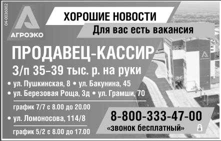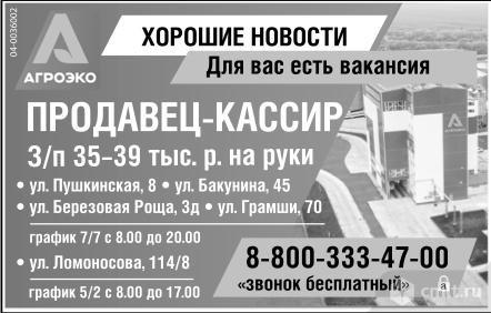 Продавец-кассир требуется. Зарплата 35-39 тыс. р. на руки. Ул. Пушкинская, 8, ул. Бакунина, 45, ул. Березовая Роща, 3д, ул. Грамши, 70. График 7/7, с 8.00 до 20.00. Ул. Ломоносова, 114/8. График 5/2, с 8.00 до 17.00. Агроэко. Хорошие новости. Для вас есть вакансия.
