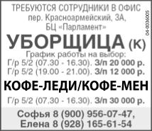 Уборщица/ уборщик требуется. График работы на выбор: 5/2 (7.30-16.30), зарплата 20 тыс. р., 5/2 (19.00-21.00), зарплата 12 тыс. р. Кофе-леди/ кофе-мен требуется. График 5/2 (7.30-16.30), зарплата 30 тыс. р. Сотрудники в офис: пер. Красноармейский, 3А, БЦ Парламент.