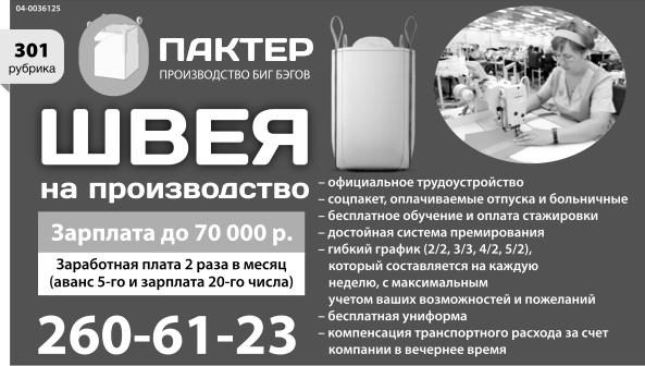 Швея на производство. Зарплата до 70 тыс. р. Заработная плата 2 раза в месяц (аванс 5-го и зарплата 20-го числа). Официальное трудоустройство. Соцпакет, оплачиваемые отпуска и больничные. Бесплатное обучение и оплата стажировки. Достойная система премирования. Гибкий график (2/2, 3/3, 4/2, 5/2), который составляется на каждую неделю с максимальным учетом ваших возможностей и пожеланий. Бесплатная униформа. Компенсация транспортного расхода за счет компании в вечернее время. Пактер. Производство биг бэгов.