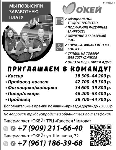 Кассир, 38300-44200 р., продавец-логист, 42700-49300 р., фасовщики/ мойщики, 34600-39800 р., повар/ пекарь, 46200-53400 р., продавец, 38700-44700 р. Гипермаркет Окей приглашает в команду! Мы повысили заработную плату. Официальное трудоустройство. Полная или частичная занятость. Обучение и карьерный рост. Корпоративная система бонусов. Скидки на товары для сотрудников. Оплата медкнижки и ДМС. Дополнительные премии по акции "приведи друга" до 20 тыс. р. По вопросам трудоустройства обращаться по телефонам: