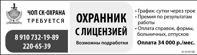 Охранник с лицензией требуется. Возможны подработки. График: сутки через трое. Премия по результатам работы. Оплата справок, формы, больничных, отпусков. Оплата 34 тыс. р./мес. ЧОП СК-Охрана.