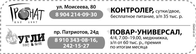 Контролер, график сутки/двое, бесплатное питание, зарплата 35 тыс. р., требуется в магазин Гранат, ул. Моисеева, №80. Повар-универсал, график 4/4, 7.00-19.00, медкнижка, зарплата от 60 тыс. р., премия по итогам месяца, требуется в кафе Маугли, пр. Патриотов, №24д.