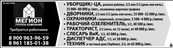Уборщик/ уборщица, разные районы, график 2/2 или 5/2 (день или ночь), 35-80 тыс. р./мес., возможны короткие графики. Дворники, график 2/2 или 5/2 (день или ночь), 35-52 тыс. р./мес. Охранники с лицензией, сутки/двое, 3.5-4 тыс. р./смена. Рабочий-озеленитель, график 5/2, 40.5 тыс. р./мес. Тракторист, график 2/2 (ночь, по 12 часов), от 60 тыс. р./мес. Слесарь ВиК, график 5/2, 65 тыс. р./мес. Диспетчер АДС, график 1/3, от 50 тыс. р./мес. Техник в частный дом (Торбово), график 5/2, от 65 тыс. р./мес. Группа компаний Мегион. Требуются работники.