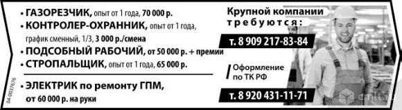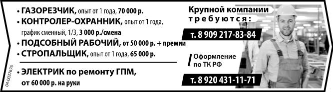Газорезчик, опыт от 1 года, 70 тыс. р. Контролер-охранник, опыт от 1 года, график сменный, 1/3, 3000 р./смена. Подсобный рабочий, от 50 тыс. р. + премии. Стропальщик, опыт от 1 года, 65 тыс. р. Электрик по ремонту ГПМ, от 60 тыс. р. на руки. Требуются крупной компании. Оформление по ТК РФ.