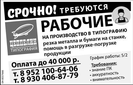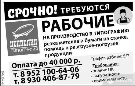 Рабочие на производство в типографию срочно требуются. Резка металла и бумаги на станке, помощь в разгрузке-погрузке продукции. График работы: 5/2. Требования: знание ПК, аккуратность, внимательность. Оплата до 40 тыс. р. Типография Цеппелин.