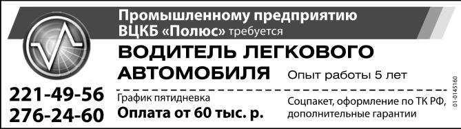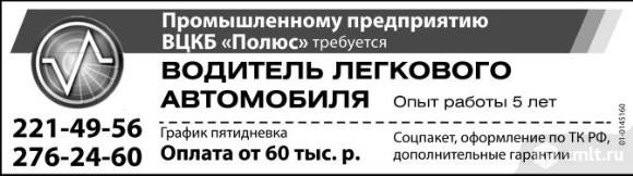 Водитель легкового автомобиля требуется промышленному предприятию ВЦКБ Полюс. Опыт работы 5 лет. График пятидневка. Оплата от 60 тыс. р. Соцпакет, оформление по ТК РФ, дополнительные гарантии.