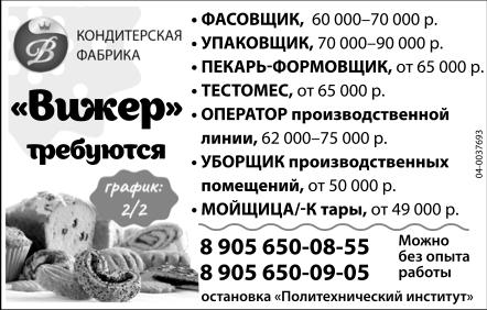 Фасовщик, 60-70 тыс. р., упаковщик, 70-90 тыс. р., пекарь-формовщик, от 65 тыс. р., тестомес, от 65 тыс. р., оператор производственной линии, 62-75 тыс. р., уборщик производственных помещений, от 50 тыс. р., мойщица/мойщик тары, от 49 тыс. р., требуются кондитерской фабрике Вижер. Можно без опыта работы. График 2/2. Ост. Политехнический институт.