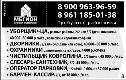 Уборщик/ уборщица, разные районы, график 2/2 или 5/2 (день или ночь), 40-80 тыс. р./мес., возможны короткие графики. Дворники, график 2/2 или 5/2 (день или ночь), 40-60 тыс. р./мес. Охранники с лицензией, сутки/двое, 4 тыс. р./смена. Чистильщик ковролина, график 2/2 (ночь), 48 тыс. р./мес. Слесарь-сантехник, график 5/2, зарплата 55 тыс. р. Оператор парковки, график 1/2 (8.00-1.00), от 37 тыс. р./мес. Бармен-кассир, график 2/2, от 38 тыс. р./мес. Группа компаний Мегион. Требуются работники.