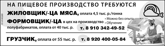 Жиловщик/ жиловщица мяса, оплата 4.5 тыс. р./тонна, формовщик/ формовщица в цех на производство полуфабрикатов, оплата от 40 тыс. р., грузчик, оплата от 55 тыс. р., требуются на пищевое производство. Можно без опыта работы. Обучение.