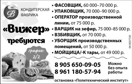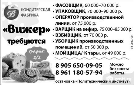 Фасовщик, 60-70 тыс. р., упаковщик, 70-90 тыс. р., оператор производственной линии, от 75 тыс. р., варщик на зефир, 75-85 тыс. р., взбивщик, от 70 тыс. р., уборщик производственных помещений, от 50 тыс. р., мойщица/мойщик тары, от 49 тыс. р., требуются кондитерской фабрике Вижер. Можно без опыта работы. График 2/2. Ост. Политехнический институт.