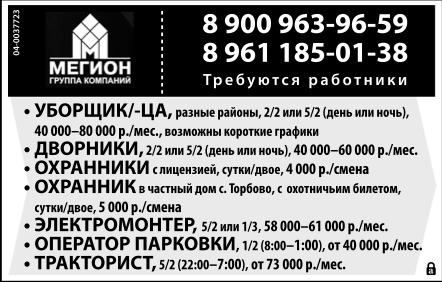 Уборщик/ уборщица, разные районы, график 2/2 или 5/2 (день или ночь), 40-80 тыс. р./мес., возможны короткие графики. Дворники, график 2/2 или 5/2 (день или ночь), 40-60 тыс. р./мес. Охранники с лицензией, сутки/двое, 4 тыс. р./смена. Охранник в частный дом, с. Торбово, с охотничьим билетом, график сутки/двое, 5 тыс. р./смена. Электромонтер, график 5/2 или 1/3, 58-61 тыс. р./мес. Оператор парковки, график 1/2 (8.00-1.00), от 40 тыс. р./мес. Тракторист, график 5/2 (22.00-7.00), от 73 тыс. р./мес. Группа компаний Мегион. Требуются работники.