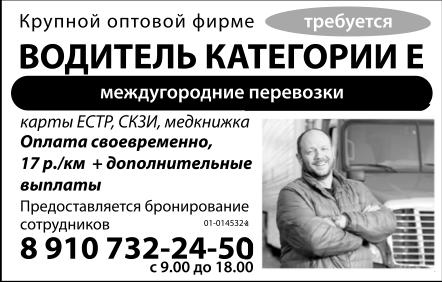 Водитель категории Е крупной оптовой фирме требуется. Междугородние перевозки. Карты ЕСТР, СКЗИ. Медкнижка. Оплата своевременно, 17 р./км + дополнительные выплаты. Предоставляется бронирование сотрудников.