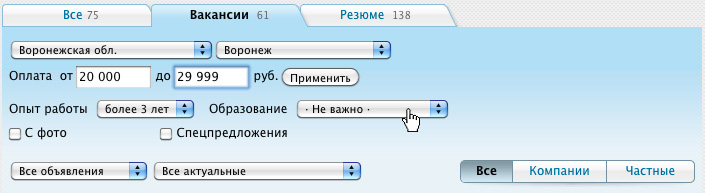 Если вы ищете работу, то, воспользовавшись фильтрами «Опыт работы» и «Образование», сможете выбрать подходящую вакансию буквально в несколько кликов. Кроме того, вы по-прежнему сможете подобрать нужные предложения по уровню предлагаемой зарплаты.