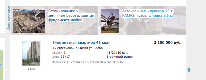 Объявление с «Лидером просмотров» на общих основаниях публикуется в своей рубрике. А в дополнительных рубриках оно занимает места в вип-блоках: в списке объявлений и слева от списка, среди баннерной рекламы.