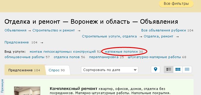 Теперь все предложения об установке натяжных потолков находятся в одной рубрике с другими ремонтно-отделочными работами.