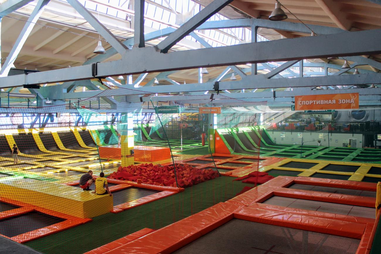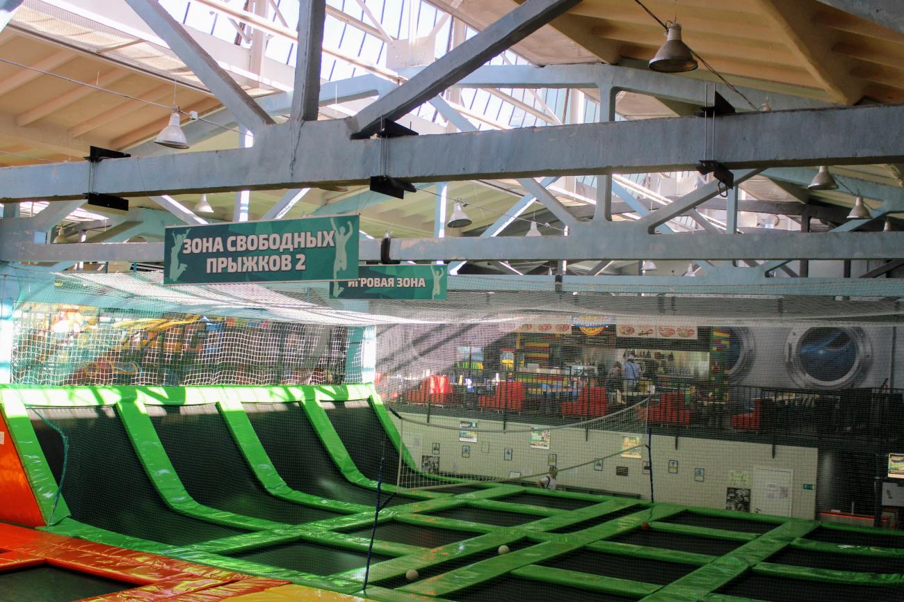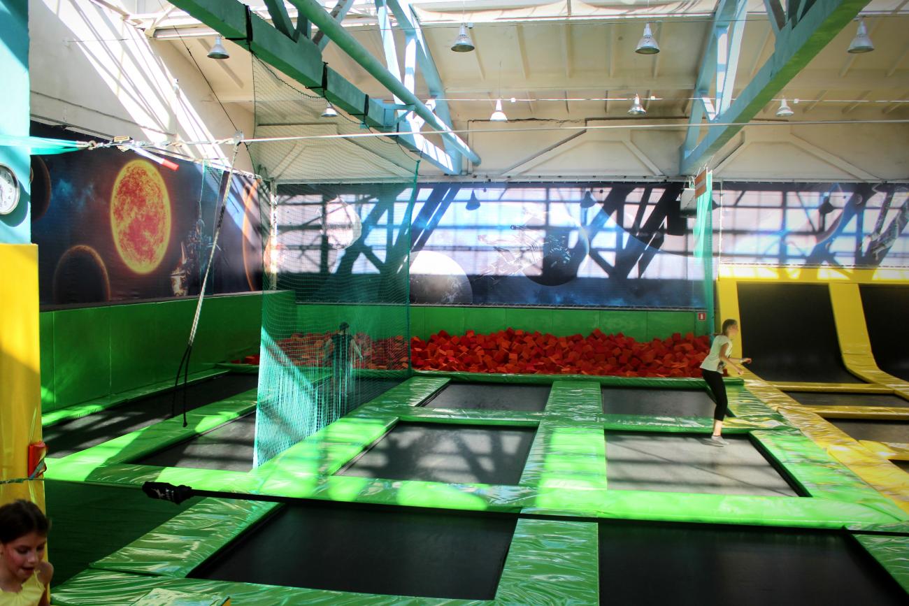 85 батутов, скалодром, аэрохоккей, виртуальная реальность, слэклайн (хождение по натянутой стропе), баскетбольное кольцо, зона волейбола и доджбола (вышибалы на батутах), детская зона с каруселями, гигантским LEGO, домом космонавта и огромным 5-этажным лабиринтом «Галактика».